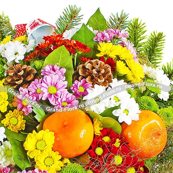 Уменьшенный: хризантема кустовая белая - 2шт., хризантема кустовая желтая - 2шт., хризантема кустовая красная - 2шт., хризантема кустовая розовая - 2шт., хризантема зеленая (сантини) - 2шт., еловая ветвь, новогодний колокольчик, новогодний декор и зелень, сетка.