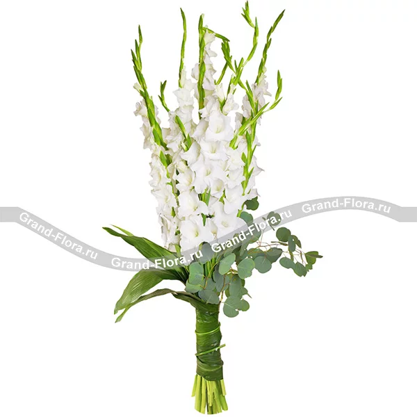 Стандартный: белый гладиолус - 11 шт., декоративная зелень, упаковка, лента белая.