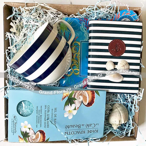 блокнот-ежедневник - 1шт., чашка - 1 шт., маска для лица  «Deep sea» - 1 шт., соль для ванны «Лазурный берег» - 1 шт., подарочная коробка, наполнитель, декор (ракушки).